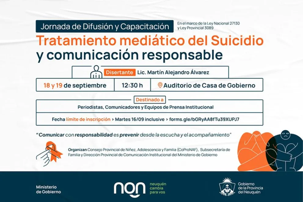 Con el objetivo de brindar herramientas y actualizar conocimientos sobre cómo comunicar durante el abordaje del suicidio y el resguardo de información sensible, el Gobierno provincial, a través del ministerio de Gobierno, llevará adelante una jornada de difusión y capacitación sobre “La comunicación de los comportamientos autodestructivos en forma responsable”, dentro de la ley nacional 27.130 y la ley provincial 3089.